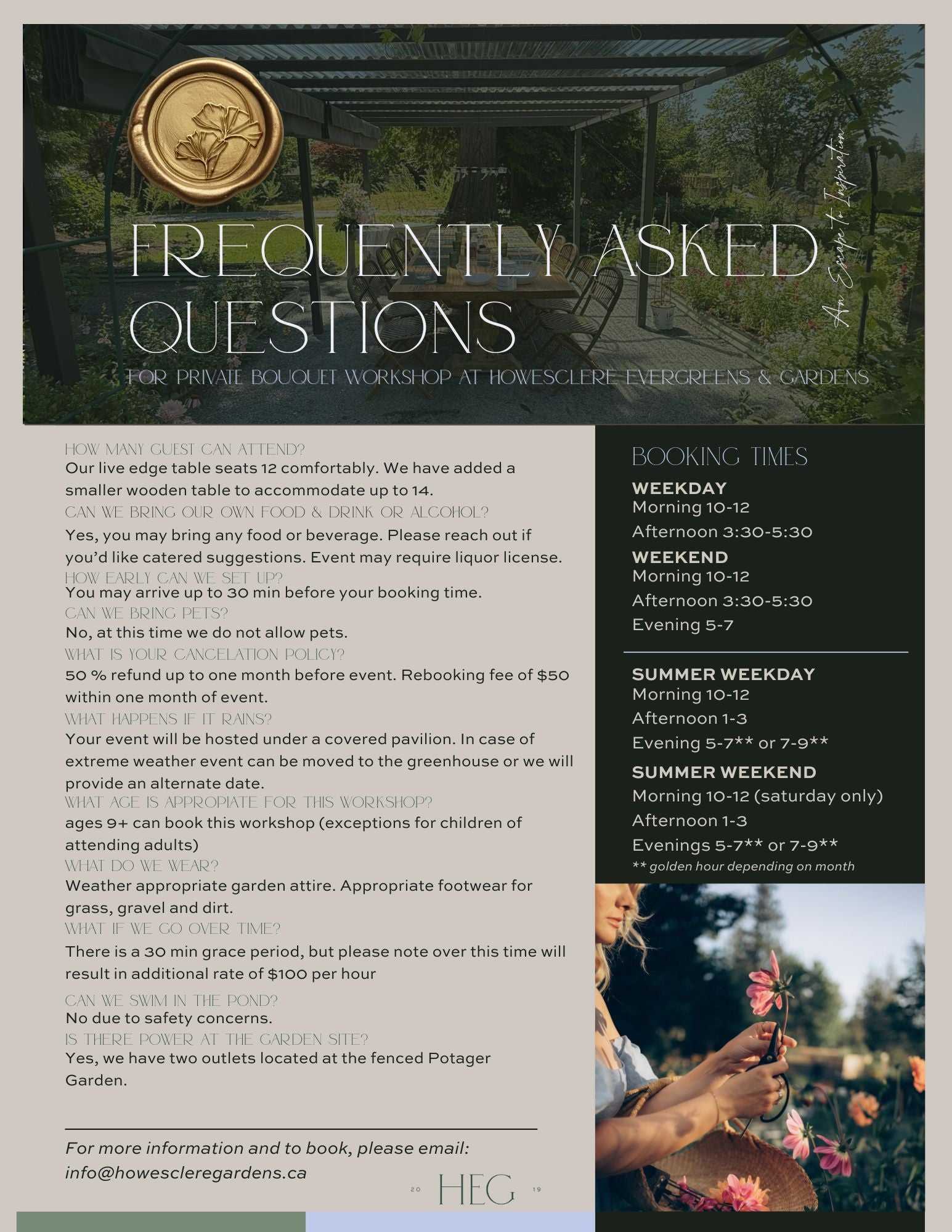 To confirm date availability please email us at info@howescleregardens.ca.